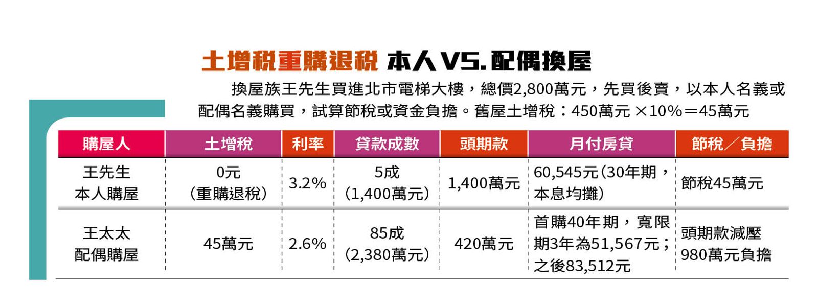 相對來說,若第2間屋仍是以王先生名字購買,則可享重購退稅,土增稅稅負為零;然而貸款成數恐降至5成、利率升破3%,光是頭期款部分就要多準備980萬元(以房價2,800萬元,貸款成數從85成降至5成計算)。如何取捨,就要看王先生手上是否有足夠的自備款。