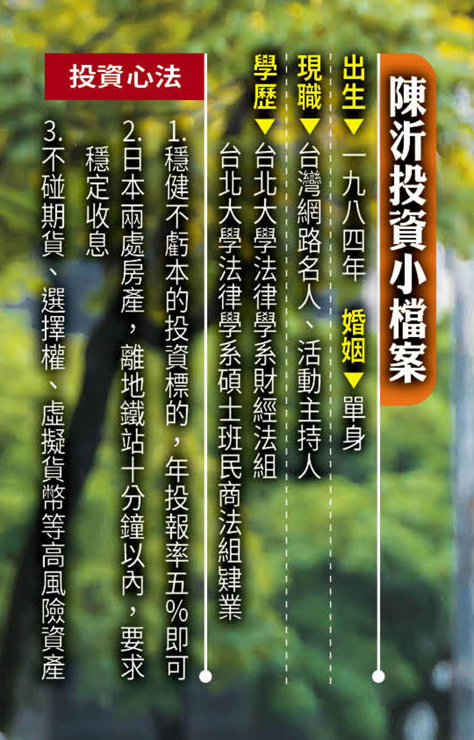 「你們要採訪我談理財?我很穩健、保守耶,我的做法真的不適合想賺大錢的人啦,我算是個怕麻煩的極簡派。」網紅陳沂受訪時的開場,急著先替自己下了這樣的註解,語氣直接卻誠懇。相較她平時的犀利發言,此時陳沂像是另外一個人似的,少了鋒芒,多了紀律。