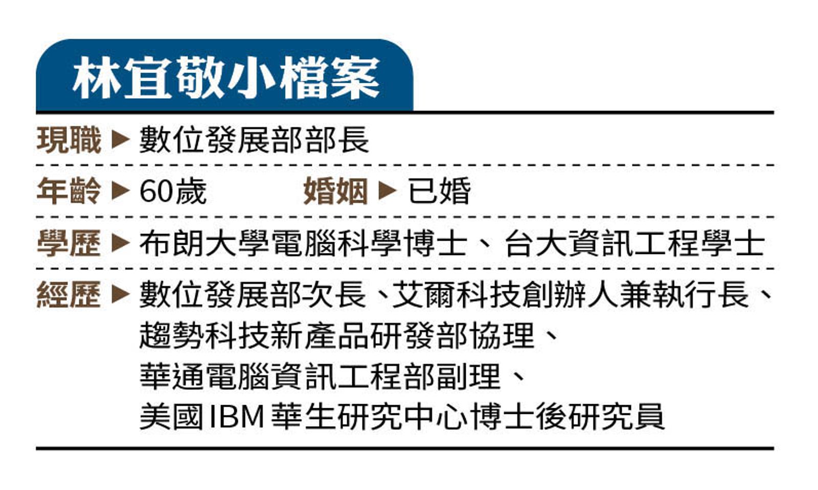 由於數發部掌握資通訊與網路傳播等數位產業發展,統籌數位治理與基礎建設,並身負數位經濟發展與國家數位轉型的重責大任。不同於前兩任部長先後因打詐不力,慘遭立委炮轟,林宜敬一上任直接表態,以「推動AI(人工智慧)產業發展」、「強化資安韌性」、「落實打詐作為」和「強化數位政府建設」四大主軸,展現不拖泥帶水的明快作風。