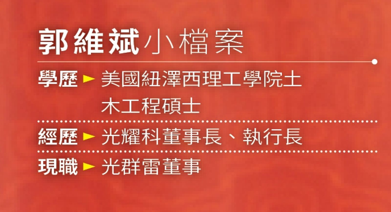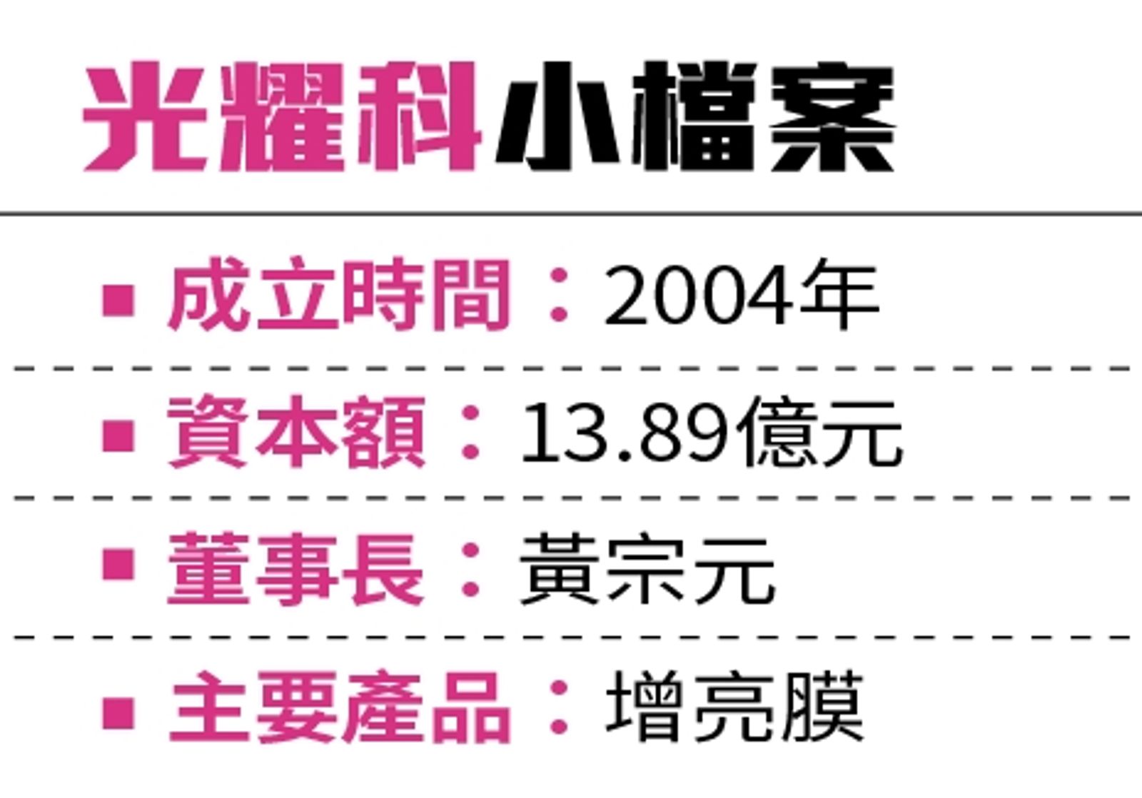 在竹科小有名氣的光耀科,是由光群雷董座郭維武與郭維斌兄弟創辦,曾在兩岸光學膜市場占有一席之地,客戶涵蓋群創、友達、京東方、華星等一線科技與面板大廠。近年來,光學膜市場競爭激烈,公司營運每況愈下,前年光耀科四處尋找新買家,被年僅38歲的春虹建設二代黃宗元,聯手4位二代好友入主。